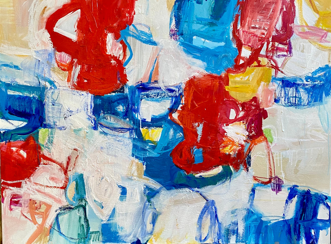 36x48 inch mixed media on gallery-wrapped canvas. Unframed. Framing options available upon request. Vibrant Reds and Blues. Acrylics, oil pastels, and various mediums. Local delivery available.